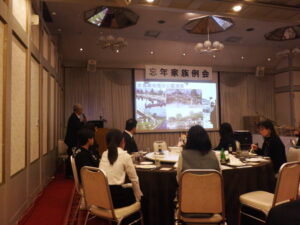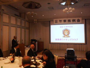 懇親会では、テーブルごとに歓談をしながら食事を楽しまれていました。また、先日行われた認証50周年記念式典で放映した「倉敷南ライオンズクラブの50年間の軌跡」を改めてご家族にプロジェクターで紹介しました。懐かしい写真があり、それぞれに思い出話に盛り上がっていました。