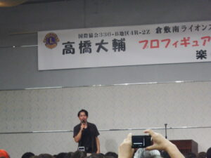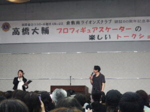 高橋大輔さんは、地元倉敷市連島の出身で、小学2年生から中学校卒業までヘルスピア倉敷のスケートリンクで練習に励み、フィギュアスケーターとしてオリンピックでのメダル獲得など活躍をされ、現在はプロフィギュアスケーターとして活動をされています。倉敷南ライオンズクラブは奉仕事業や青少年健全育成事業を行っており、今回はこの小学生向けフィギュアスケート教室を開催し、倉敷市内外から小学生65人が参加し、楽しんで頂きました。