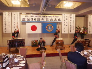 式典の待ち時間では当クラブの記念事業と50年のあゆみをプロジェクターで投影して活動の紹介をしました。また、祝宴前のアトラクションとして水島灘源平太鼓の演奏があり、祝宴では作陽音楽大学生によるフルート3重奏が流れる中で食事を楽しみました。最後の抽選会では豪華な賞品を用意するなど、参加された皆様に喜んでいただけるよう様々な工夫を凝らした会を開催することができました。